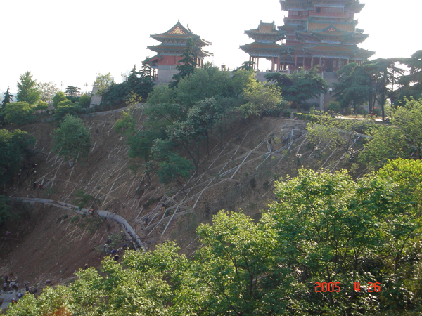 風(fēng)景秀麗的獅子山位于南京城北部,山的四周依勢(shì)建筑明代古城墻,歷史悠久,山頂?shù)拈喗瓨菤鈩?shì)宏偉,為南京市著名景點(diǎn)之一。獅子山屬于丘陵山,坡度較陡,一般在30度左右,局部達(dá)45度以上。在長期的雨水沖刷、地質(zhì)作用以及人為活動(dòng)的影響下,獅子山山體共產(chǎn)生大小14處滑坡,滑坡體較大,不但破環(huán)了景觀,還嚴(yán)重影響游客和建(構(gòu))筑物的安全。