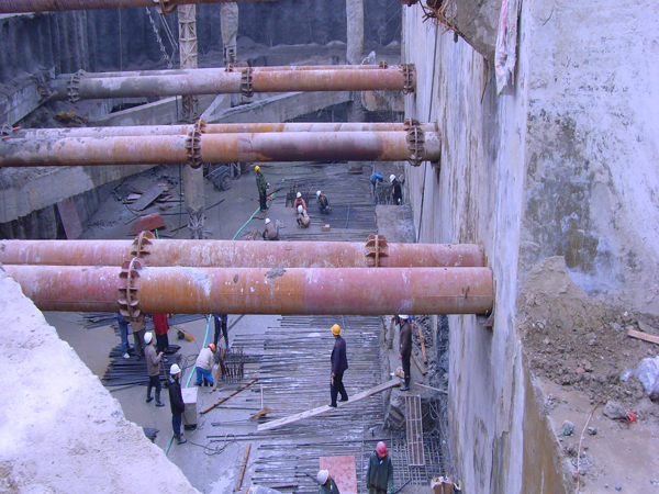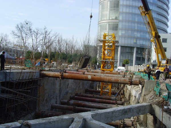 支護(hù)型式:擋土結(jié)構(gòu)采用鉆孔灌注樁加二層支撐。角撐選用鋼筋砼支撐,兩端撐在新施工的支護(hù)樁上;對(duì)撐采用鋼管支撐,一端撐在新施工的支護(hù)樁上,另一端撐在已施工地下室的樓板位置。擴(kuò)建基坑外圍采用一排三軸深攪樁止水,與原地下室止水樁搭接處采用旋噴樁止水,坑內(nèi)采用管井降水。