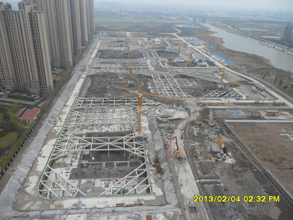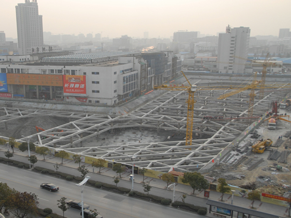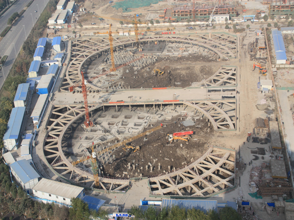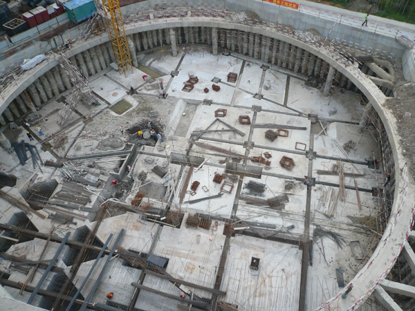 支護(hù)型式:基坑采用鉆孔灌注樁加一道砼水平支撐進(jìn)行支護(hù),支撐體系采用一大一小雙環(huán),大環(huán)直徑達(dá)128m,雙環(huán)之間設(shè)置棧橋方便土方運(yùn)輸。采用雙軸深攪樁止水,深坑部位布設(shè)降壓井,淺坑布設(shè)疏干井。圓環(huán)支撐具有剛度大,挖土空間大的特點(diǎn),節(jié)約造價(jià)約300萬且縮短了工期約3個(gè)月,取得了良好的社會(huì)經(jīng)濟(jì)效益。