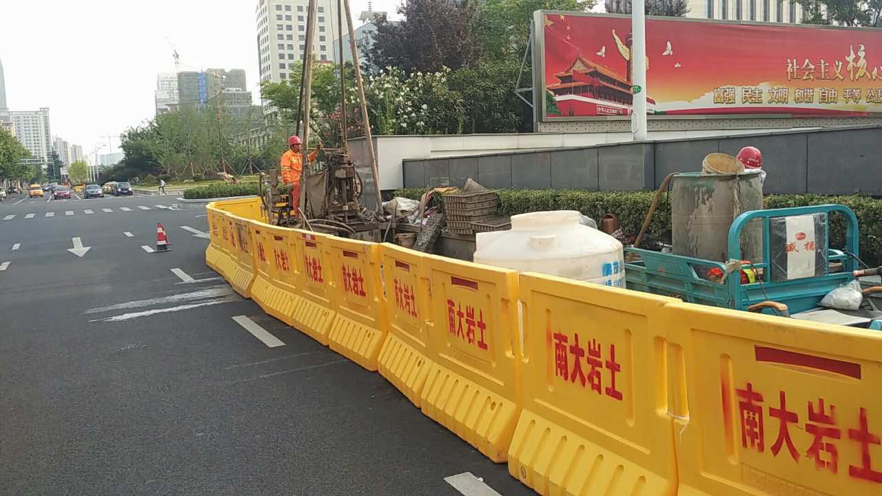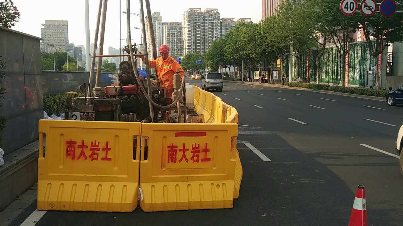 2017年5月中旬,隨著身著南大巖土字樣工作服的技術(shù)及施工人員在漢中門(mén)大街與江東路交叉口進(jìn)行施工圍擋,標(biāo)志著南京地鐵九號(hào)線D9-XK02標(biāo)地質(zhì)勘察初勘施工正式啟動(dòng)。本標(biāo)段南起漢中門(mén)大街,沿江東路向北至定淮門(mén)大街止,分為三站三區(qū)間,全長(zhǎng)約2.8km,初勘計(jì)劃工期2個(gè)月。
